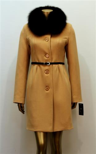 Облегающее пальто с узким кожанным ремнем и воротником из натурального меха песца. Воротник из песца отстегивается.