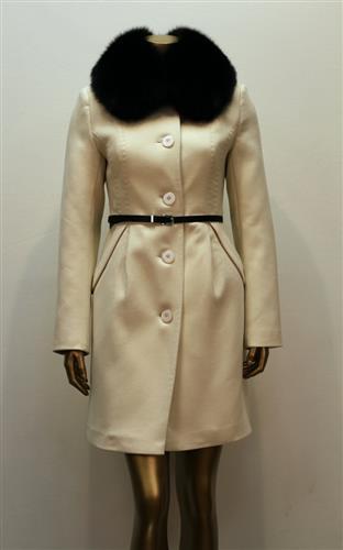 Облегающее пальто с узким кожанным ремнем и воротником из натурального меха песца. Воротник из песца отстегивается.