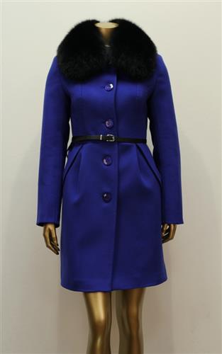 Облегающее пальто с узким кожанным ремнем и воротником из натурального меха песца. Воротник из песца отстегивается.