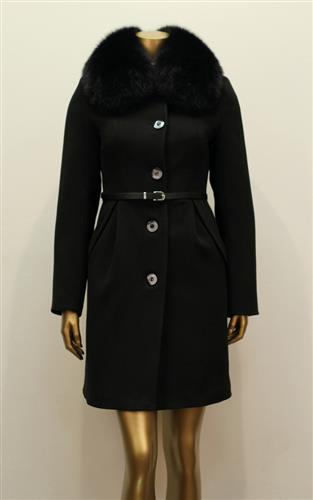 Облегающее пальто с узким кожанным ремнем и воротником из натурального меха песца. Воротник из песца отстегивается.